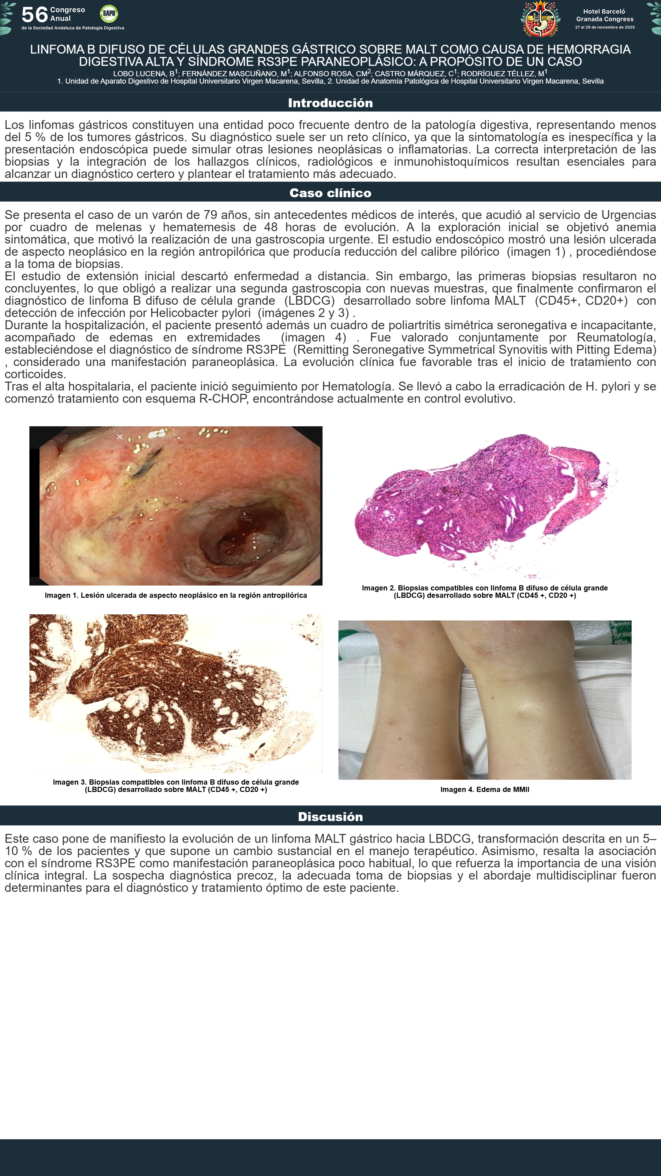 [CP-022] LINFOMA B DIFUSO DE CÉLULAS GRANDES GÁSTRICO SOBRE MALT COMO CAUSA DE HEMORRAGIA DIGESTIVA ALTA Y SÍNDROME RS3PE PARANEOPLÁSICO: A PROPÓSITO DE UN CASO
