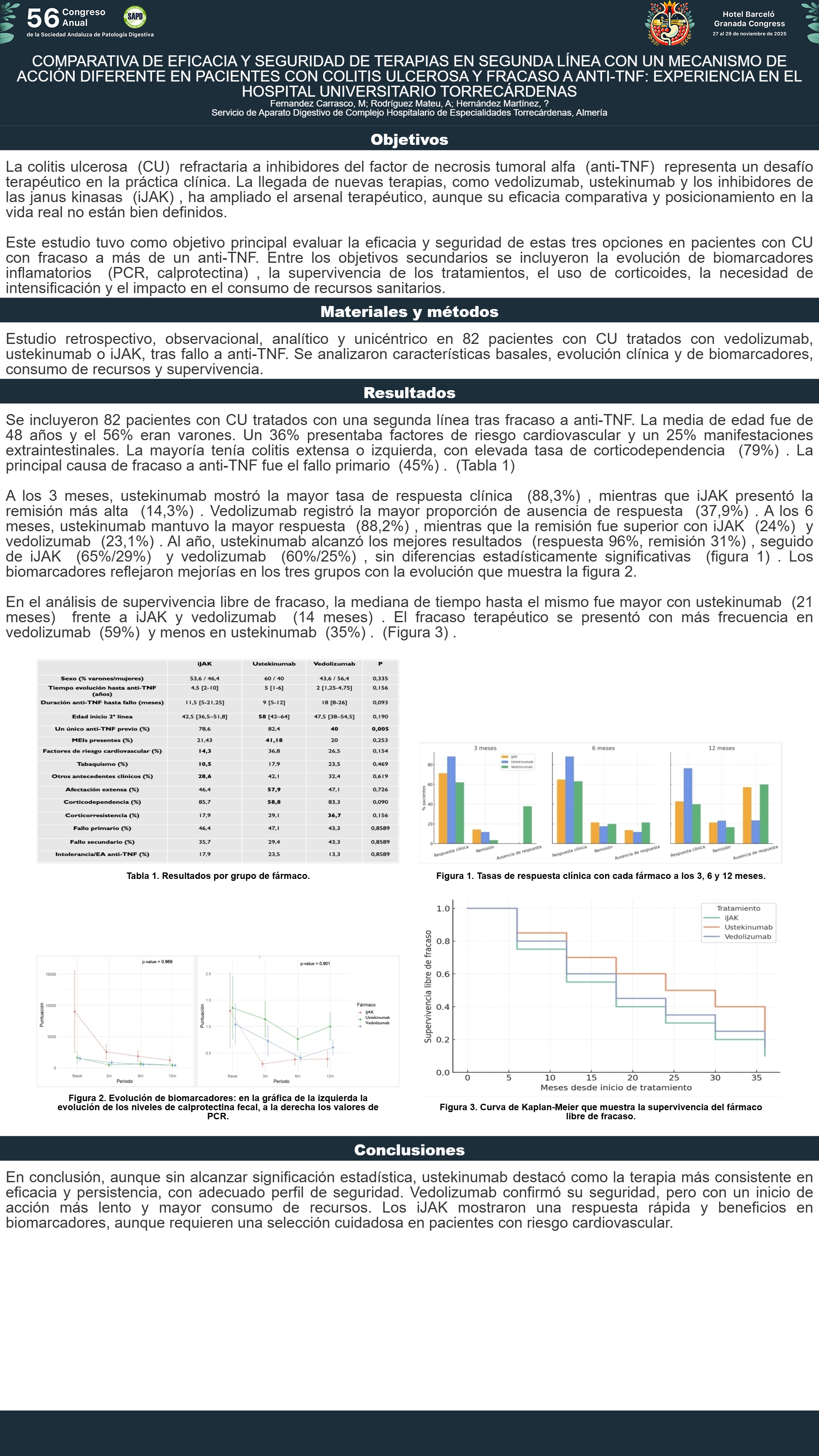 [CP-214] COMPARATIVA DE EFICACIA Y SEGURIDAD DE TERAPIAS EN SEGUNDA LÍNEA CON UN MECANISMO DE ACCIÓN DIFERENTE EN PACIENTES CON COLITIS ULCEROSA Y FRACASO A ANTI-TNF: EXPERIENCIA EN EL HOSPITAL UNIVERSITARIO TORRECÁRDENAS
