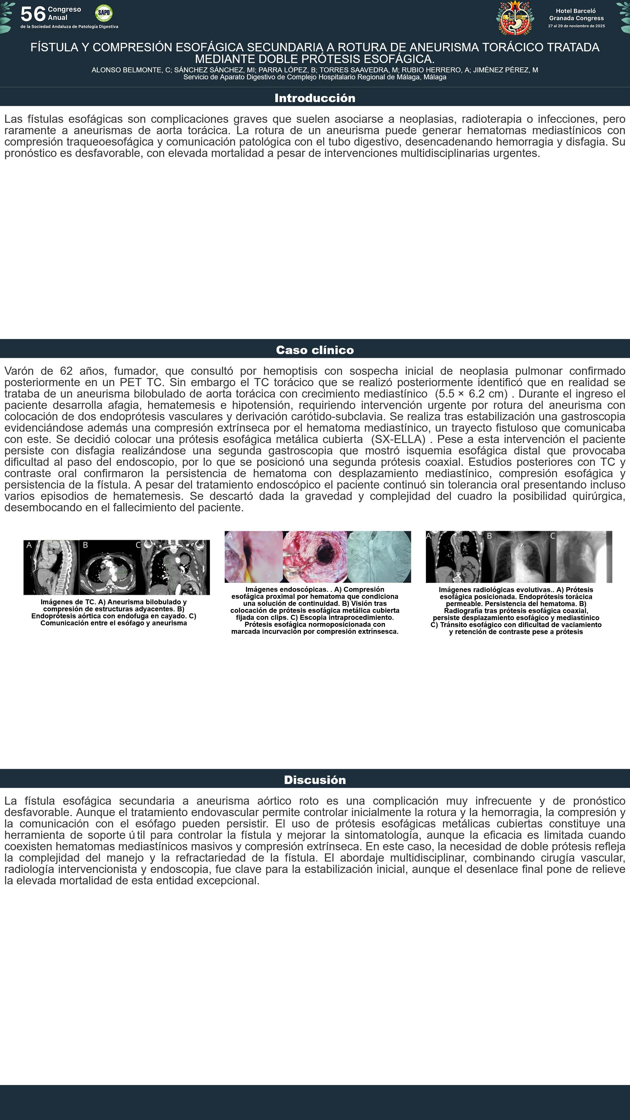[CP-003] FÍSTULA Y COMPRESIÓN ESOFÁGICA SECUNDARIA A ROTURA DE ANEURISMA TORÁCICO TRATADA MEDIANTE DOBLE PRÓTESIS ESOFÁGICA.