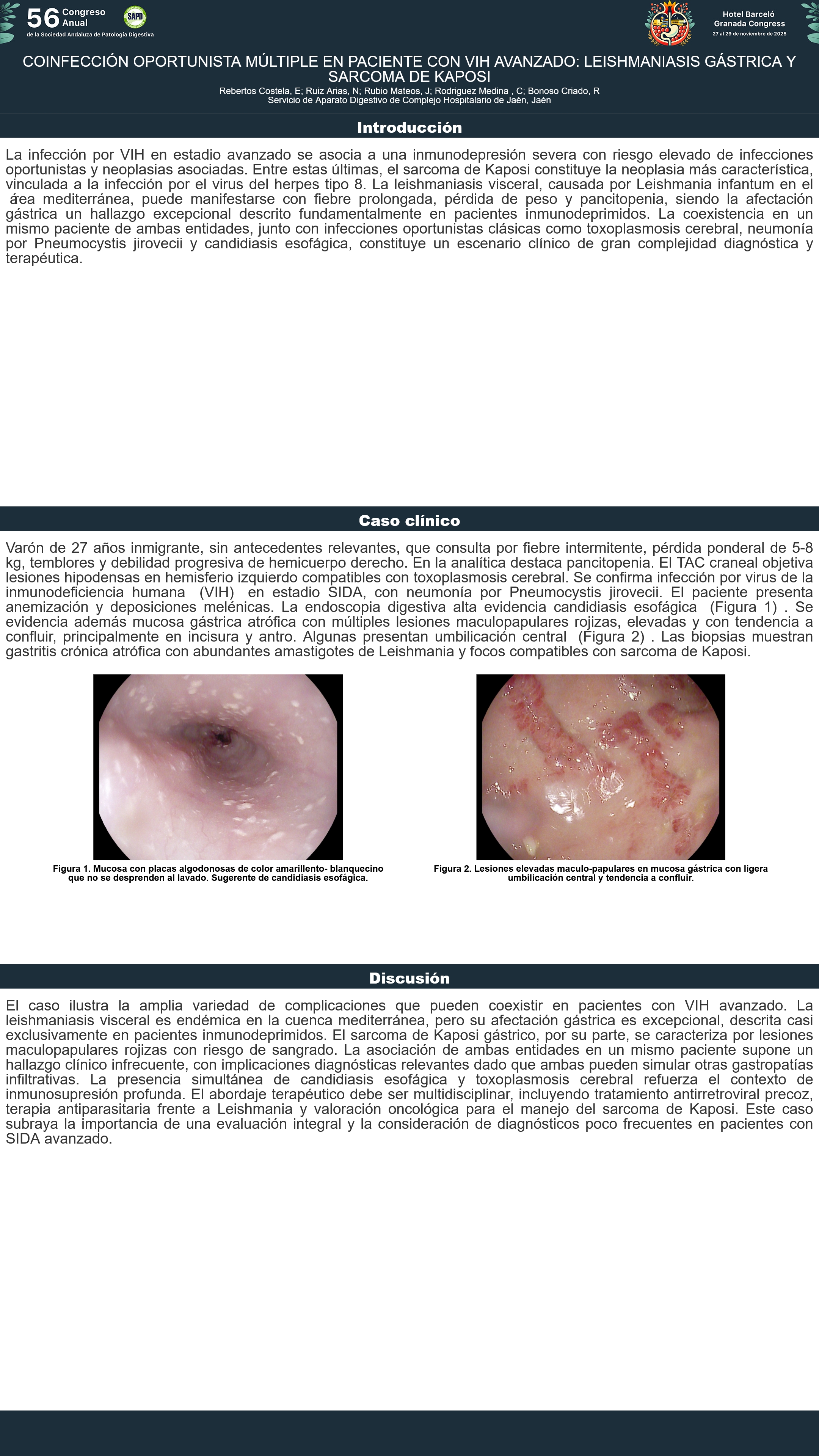 [CP-005] COINFECCIÓN OPORTUNISTA MÚLTIPLE EN PACIENTE CON VIH AVANZADO: LEISHMANIASIS GÁSTRICA Y SARCOMA DE KAPOSI