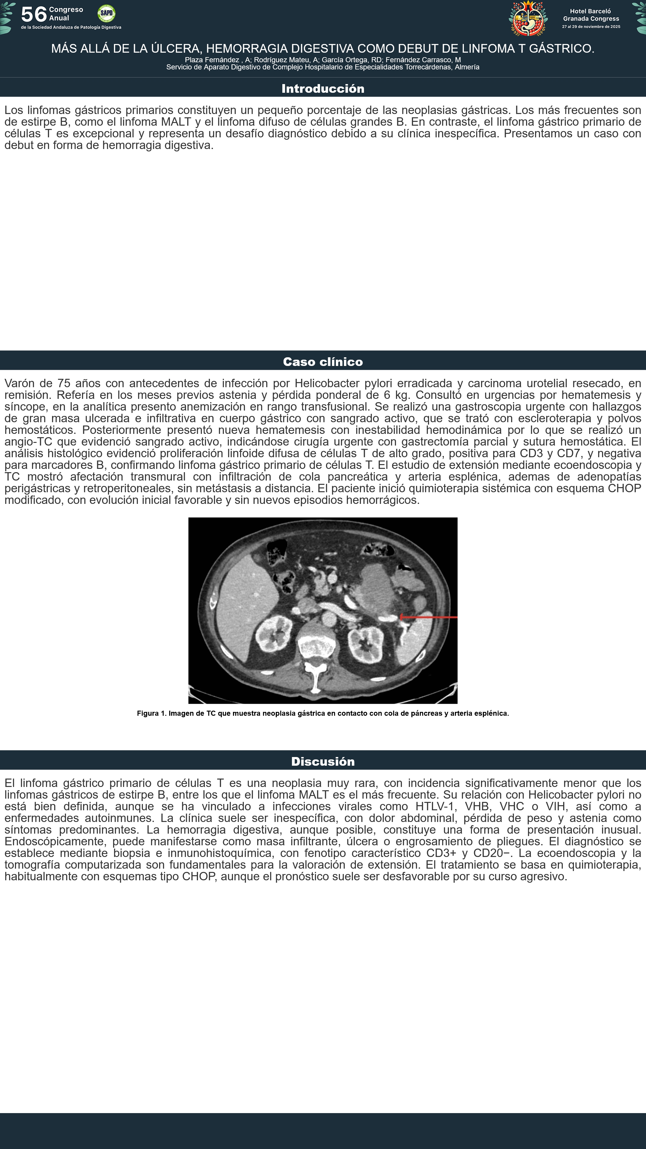 [CP-198] MÁS ALLÁ DE LA ÚLCERA, HEMORRAGIA DIGESTIVA COMO DEBUT DE LINFOMA T GÁSTRICO.