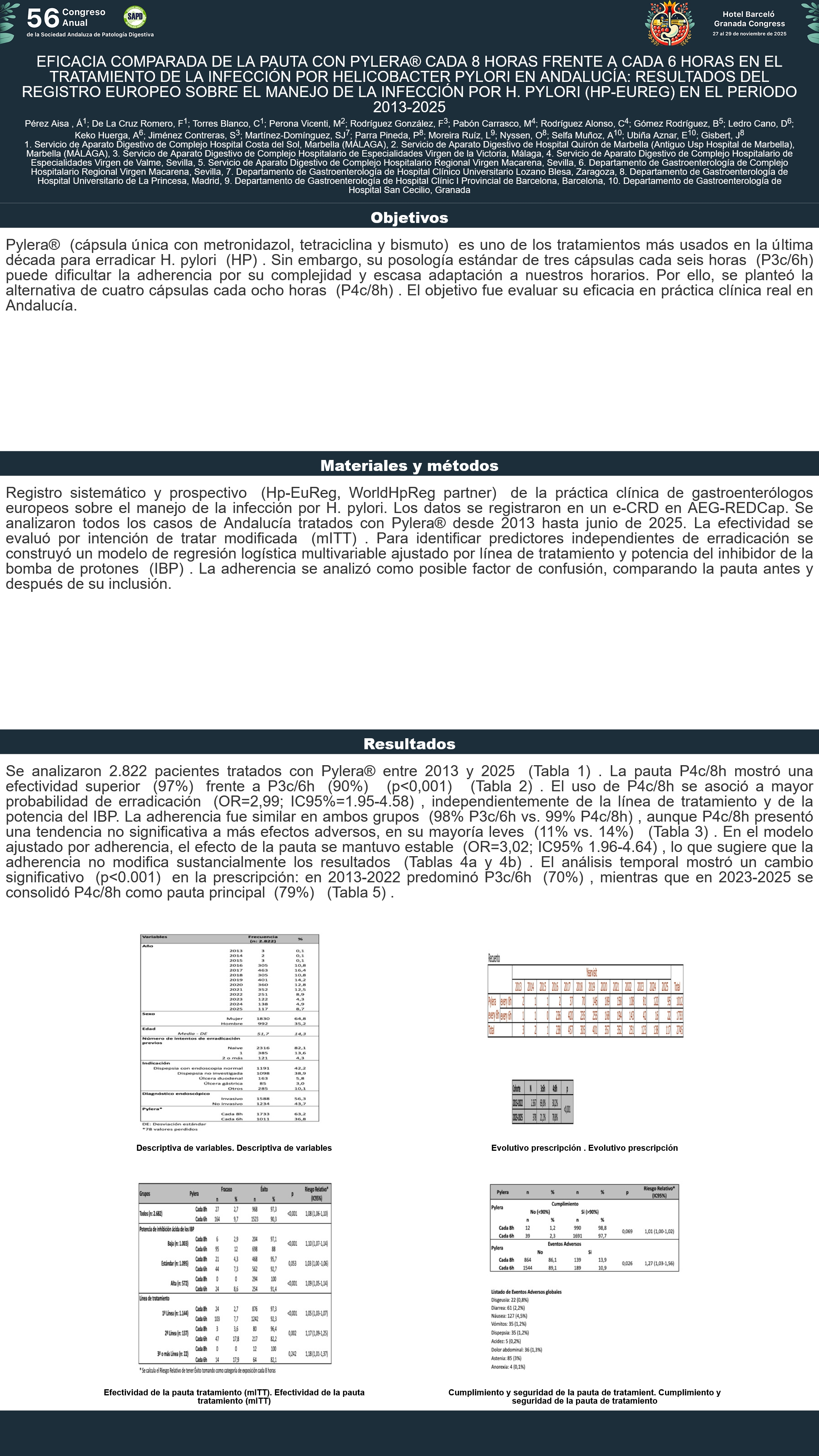 [CO-11] EFICACIA COMPARADA DE LA PAUTA CON PYLERA® CADA 8 HORAS FRENTE A CADA 6 HORAS EN EL TRATAMIENTO DE LA INFECCIÓN POR HELICOBACTER PYLORI EN ANDALUCÍA: RESULTADOS DEL REGISTRO EUROPEO SOBRE EL MANEJO DE LA INFECCIÓN POR H. PYLORI (HP-EUREG) EN EL PERIODO 2013-2025