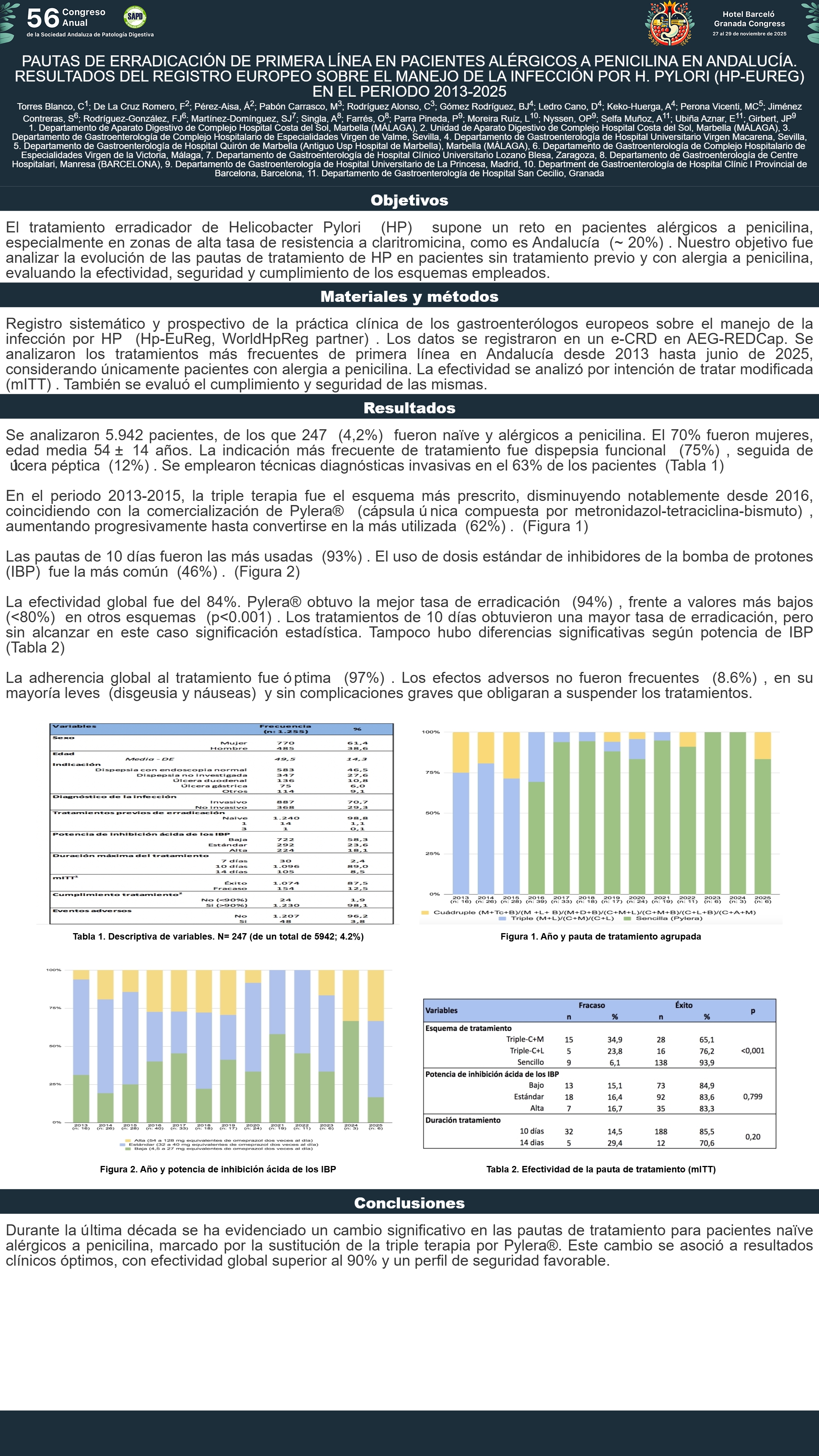 [CO-02] PAUTAS DE ERRADICACIÓN DE PRIMERA LÍNEA EN PACIENTES ALÉRGICOS A PENICILINA EN ANDALUCÍA. RESULTADOS DEL REGISTRO EUROPEO SOBRE EL MANEJO DE LA INFECCIÓN POR H. PYLORI (HP-EUREG) EN EL PERIODO 2013-2025