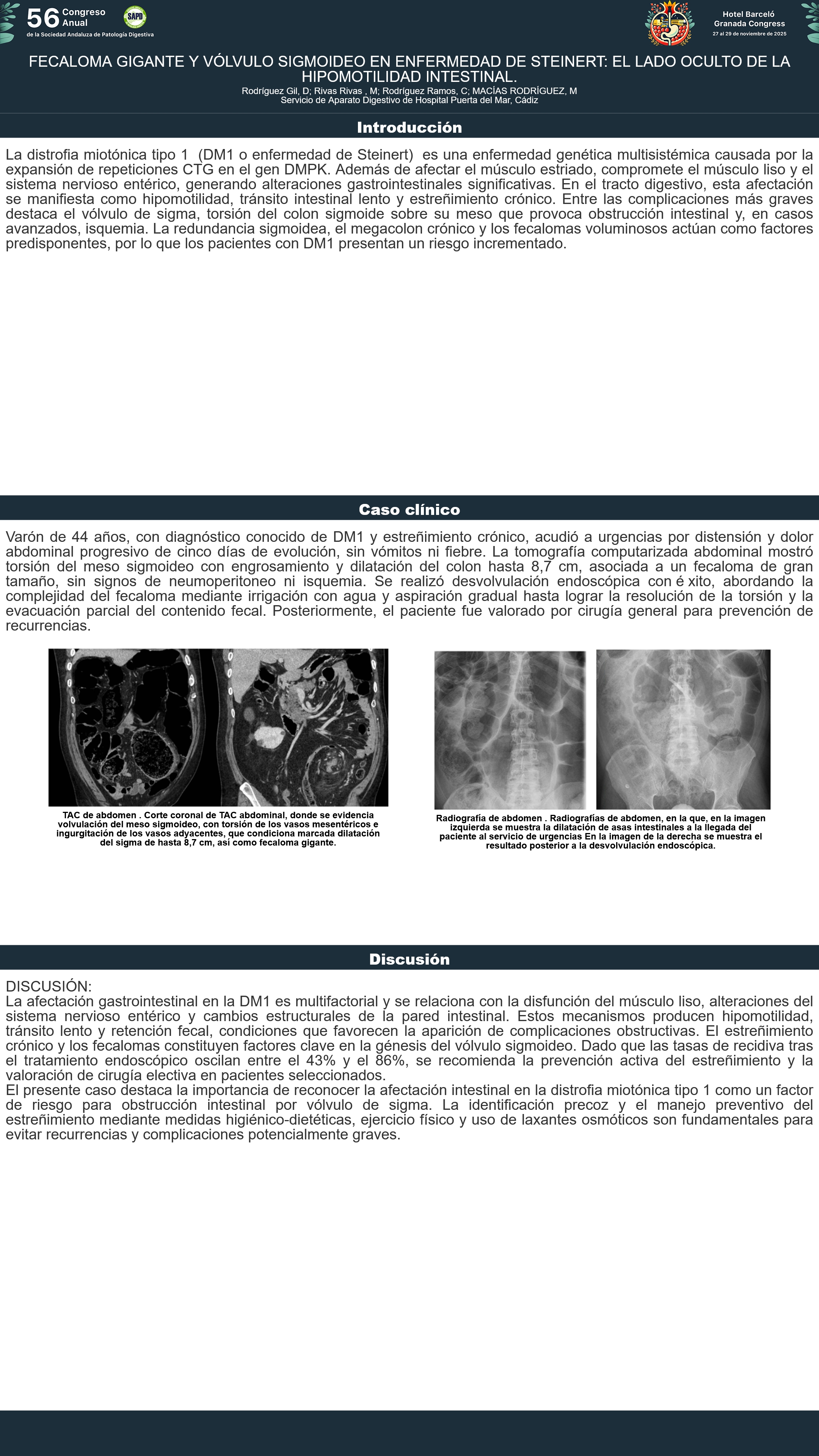 [CP-192] FECALOMA GIGANTE Y VÓLVULO SIGMOIDEO EN ENFERMEDAD DE STEINERT: EL LADO OCULTO DE LA HIPOMOTILIDAD INTESTINAL.